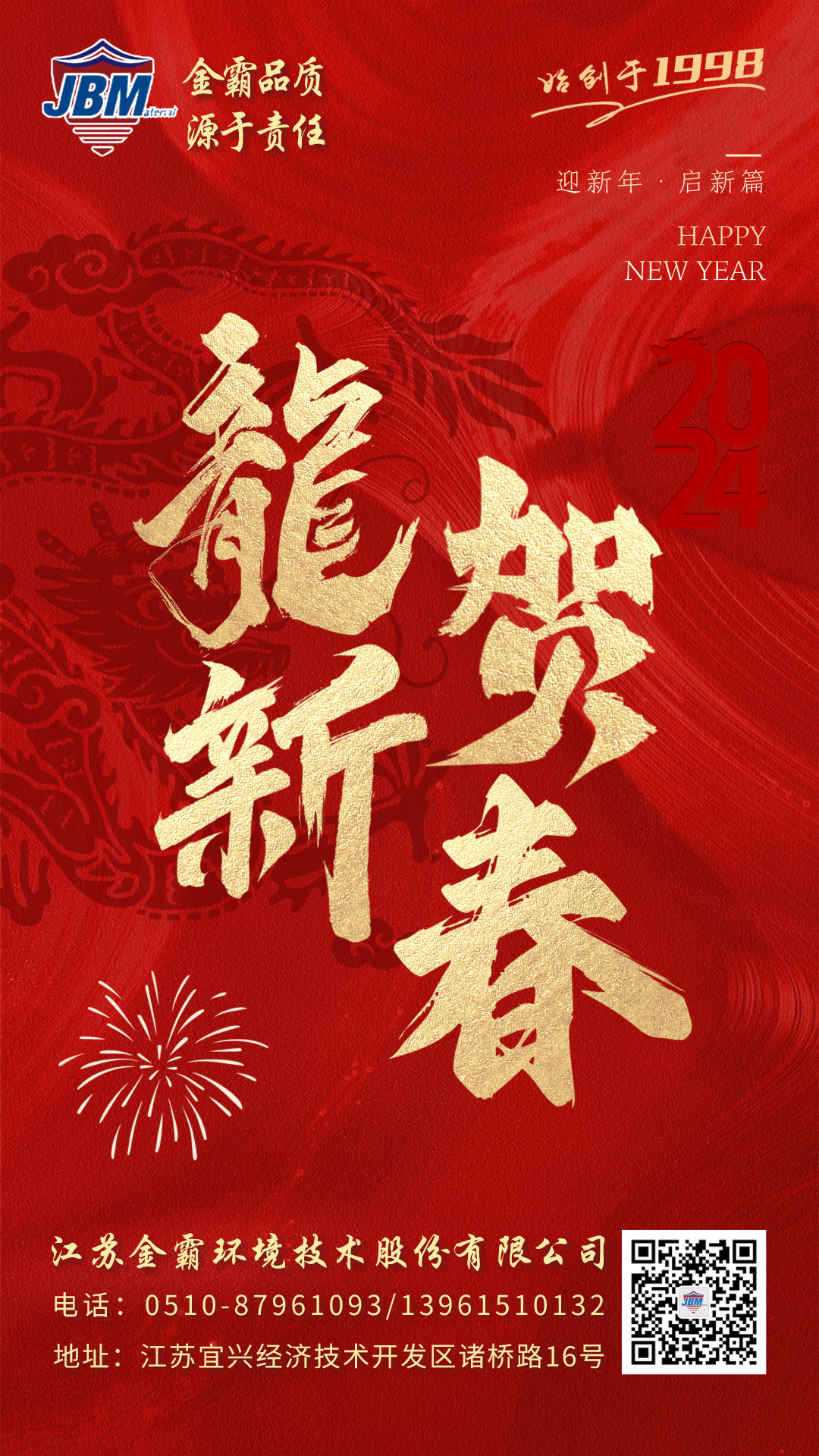 金龍送福年年順,運(yùn)轉(zhuǎn)乾坤步步高!值此新年來臨之際,江蘇金霸環(huán)境技術(shù)股份有限公司向您獻(xiàn)上誠摯的祝福,祝您身體健康,闔家幸福,萬事如意,龍年大吉!